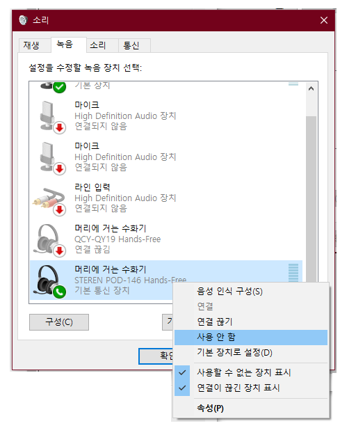 이어폰을 "사용함"으로 변경할 필요가 있습니다.