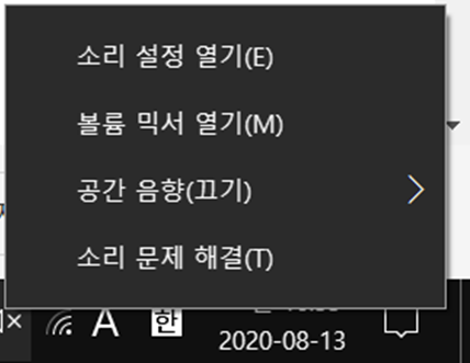 1. 우측 하단에 있는 스피커 아이콘을 우클릭합니다
