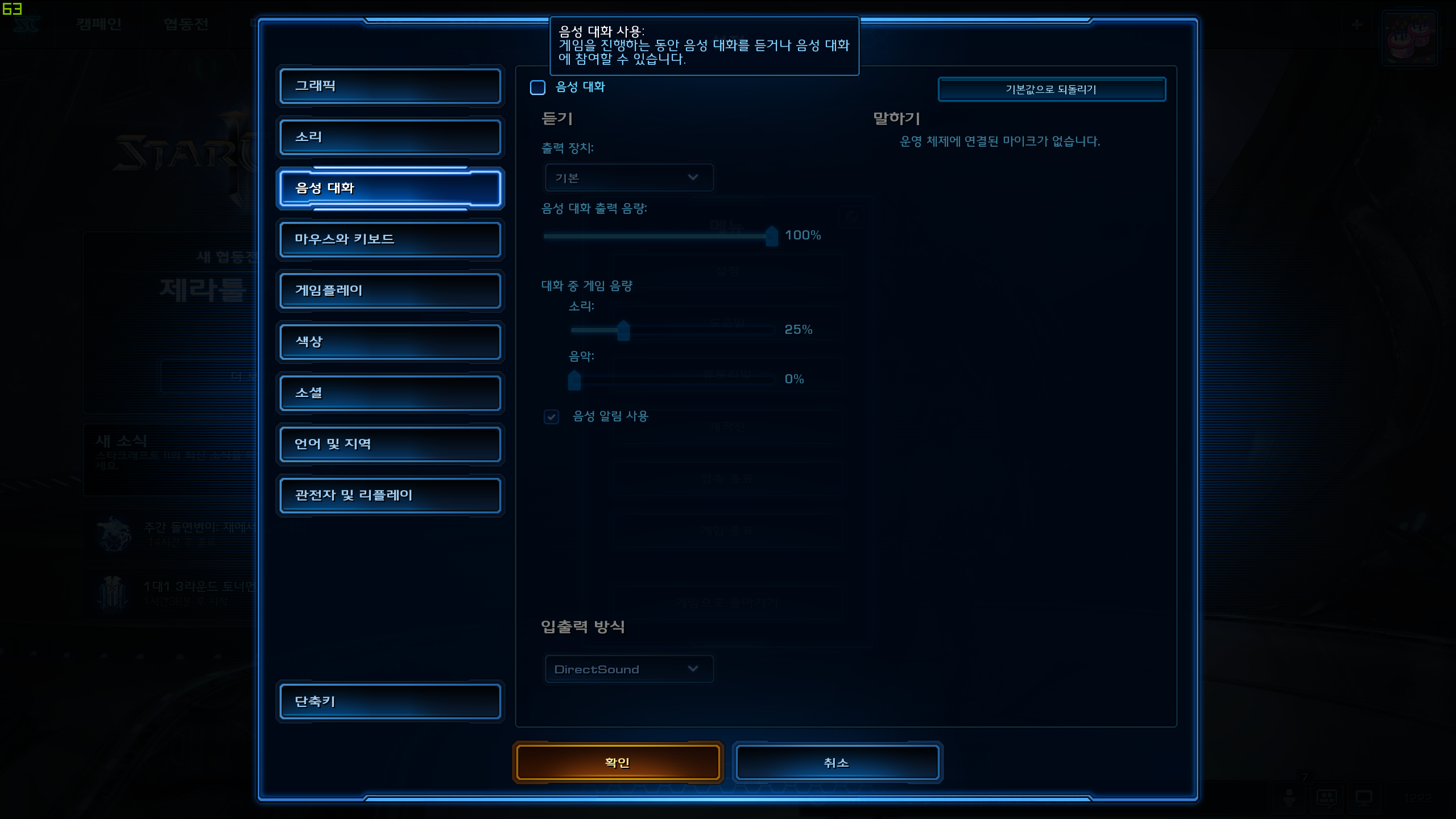 6. 스타크래프트2 게임에 접속하여 [설정] - [음성 대화] 탭을 엽니다