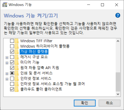 ② "가상 머신 플랫폼"에 체크를 하고 확인을 누릅니다