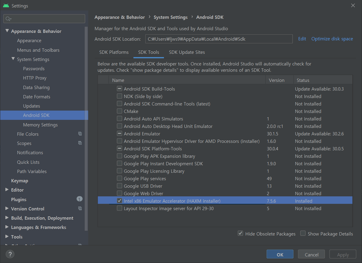 위 과정을 진행했다면 "Intel x86 Emulator Accelerator"가 재설치될 것입니다.