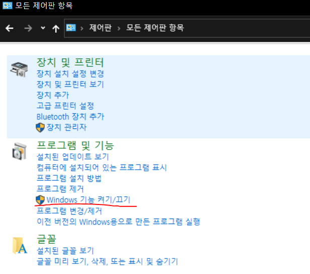 ① 제어판에서 "Windows 기능 켜기/끄기"에 들어갑니다.