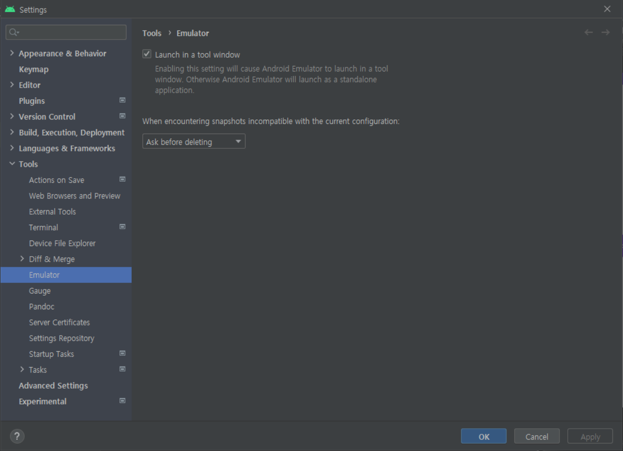 체크하면 -> 안드로이드 스튜디오 안에서 에뮬레이터가 실행됨