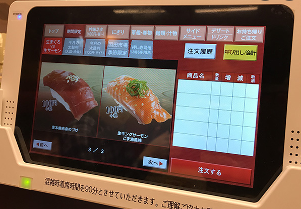 일본에서 회전 스시는 주로 태블릿을 사용하여 주문을 하고