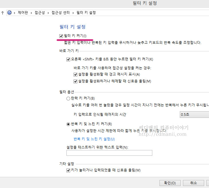그리고 다음과 같은 화면에서 "필터 키"체크를 꺼줍니다.