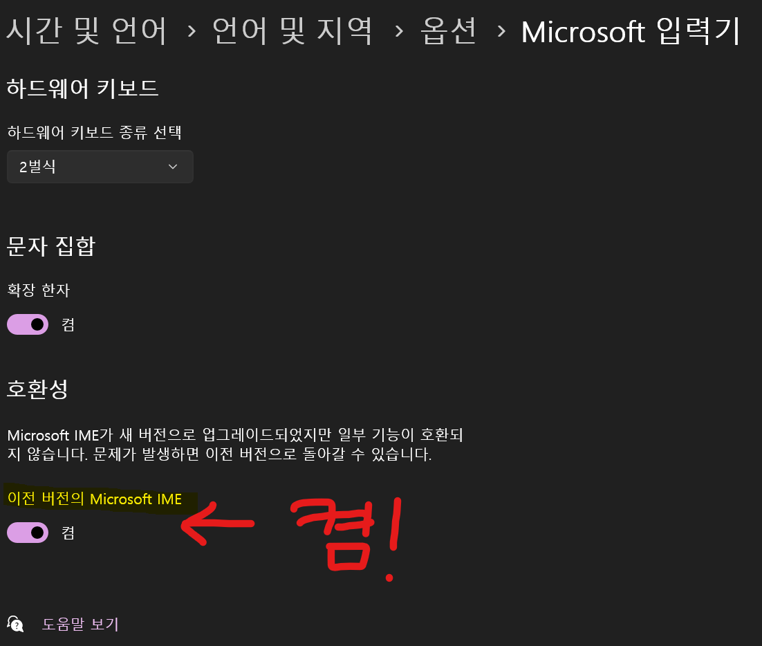 6. 제일 아래에 있는 [이전 버전의 Microsoft IME]을 on으로 설정합니다.