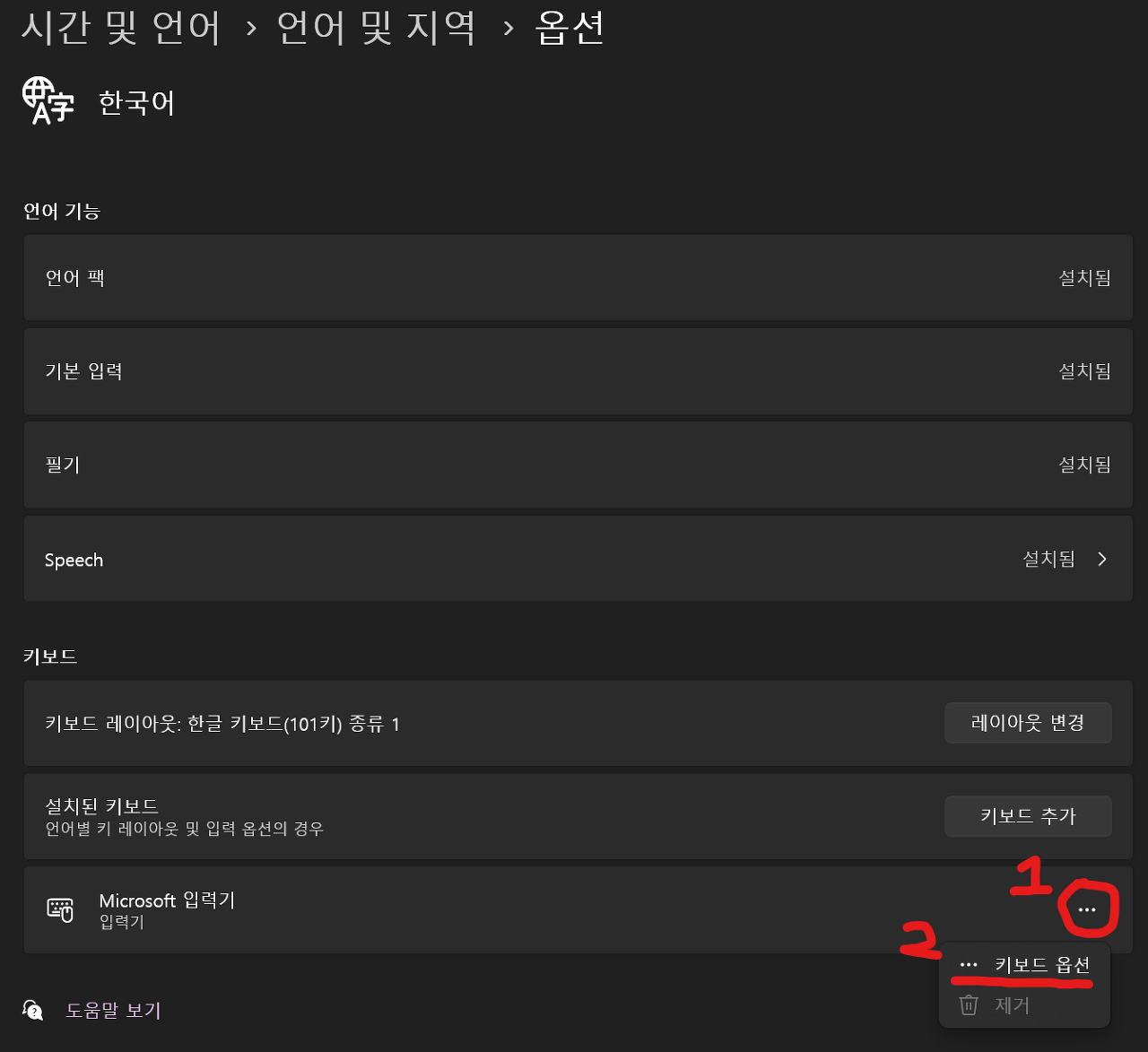 5. [Microsoft 입력기] -> [키보드 옵션]을 클릭합니다.