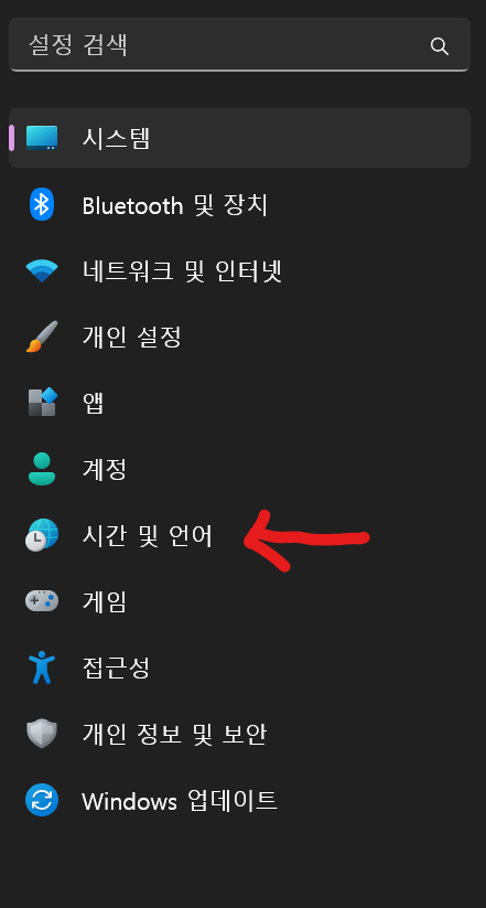 2. 왼쪽에 [시간 및 언어]를 클릭합니다.