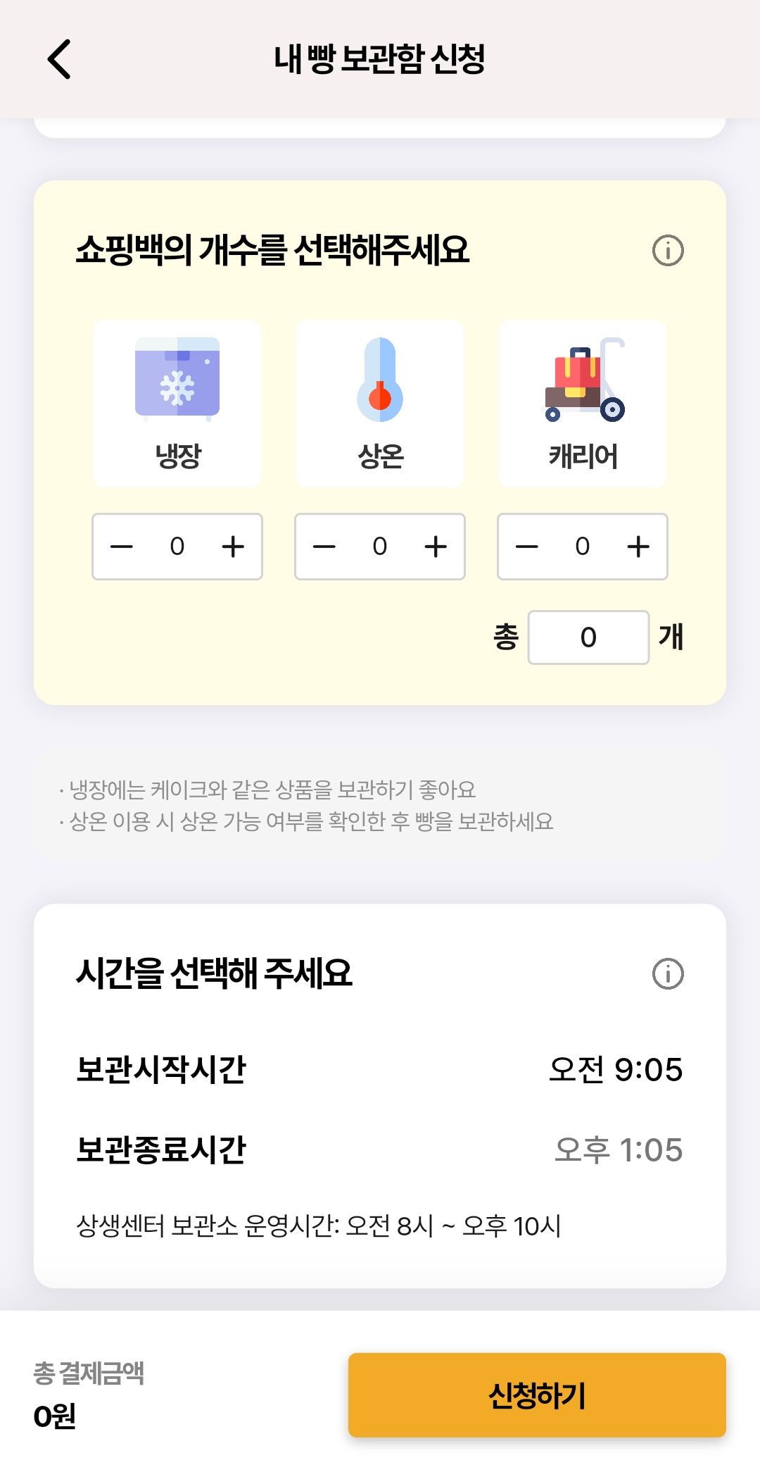 내 빵 보관 신청하기 버튼을 누르면 다음과 같이 빵 보관을 할 시간을 예약할 수 있습니다.