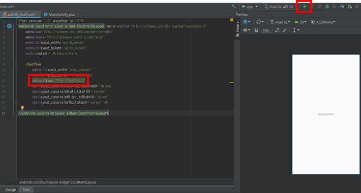Text에 있는 “Hello Android”의 텍스트를 아무 문장으로 바꿔봅시다.