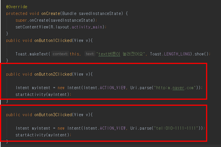 안드로이드 개발3 - 버튼에 전화, 인터넷 연결 기능 넣기
