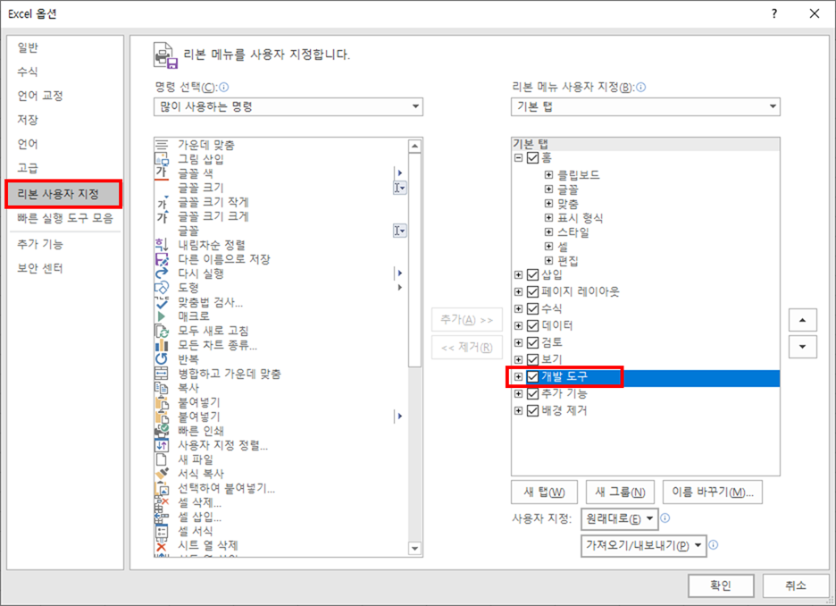 3. "개발"탭의 리본에 표시 체크