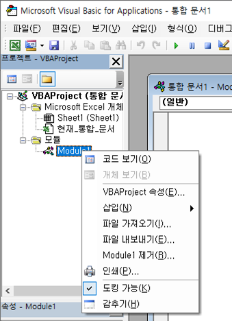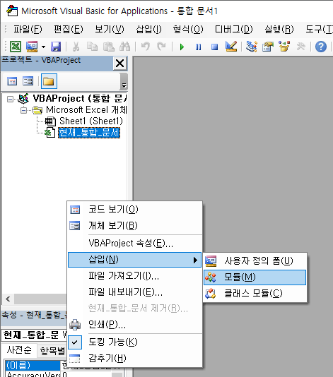 - 프로젝트 창에서 우클릭 → 삽입 → 모듈