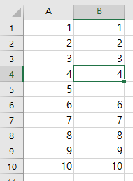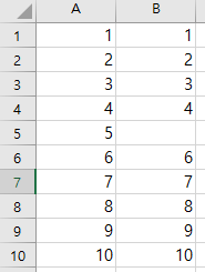 B열에서는 첫 번째 줄부터 숫자가 이어지다가 5번째 줄에서 한번 끊기게 됩니다.