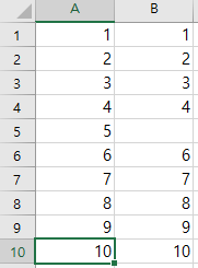 A열에서는 첫 번째 줄부터 10번째 줄까지 연속적으로 숫자가 입력되어 있습니다.