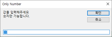 | Sub inputbox2() Dim strIn As String strIn = InputBox("값을 입력해주세요" & vbLf & "숫자만 가능합니다.", "Only Number", "10") End Sub |